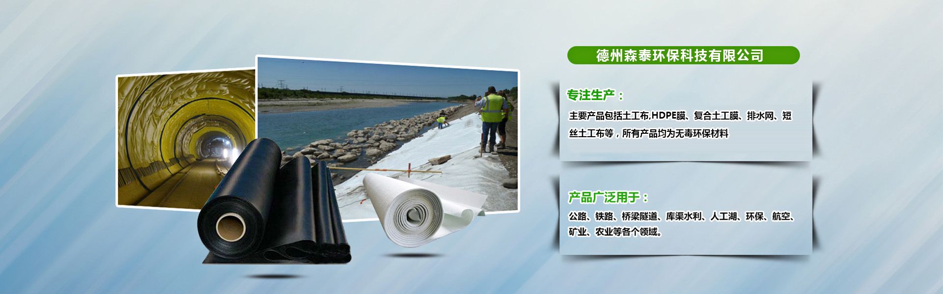 德州泰环保U技有限公司Q森泰环保专注于水利、环境及生态修复技术研发及产品刉,q有专业的施工工E技术服务团队。已完成水利工程100多项Q环境工E?00多项Q典型工E包括南水北调工E、三峡工E、߀沱河防渗工程Q保定环城水pdE、济南垃圑֡埋场工程Q桂林垃圑֡埋场工程、大同电厂防渗工E、嘉兴火车站防渗工程、黑龙江农垦防渗工程{。森泰环保主要品包括土工布,HDPE膜、复合土工膜、排水网、短丝土工布{,所有品均为无毒环保材料,可广泛应用于Q?.环境修复工程Q粮食基地土壤改良、工业场地、矿业、水体等工程、蔬菜大?LQ种植等Q?.水利工程Q江x库、堤坝的防渗加固、水渠的防渗、护坡等Q及市政防渗Q地铁、徏{物的地下工E、种植屋面、屋花园的防渗、污水管道内衬等Q?.....